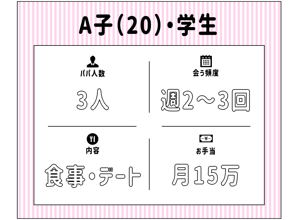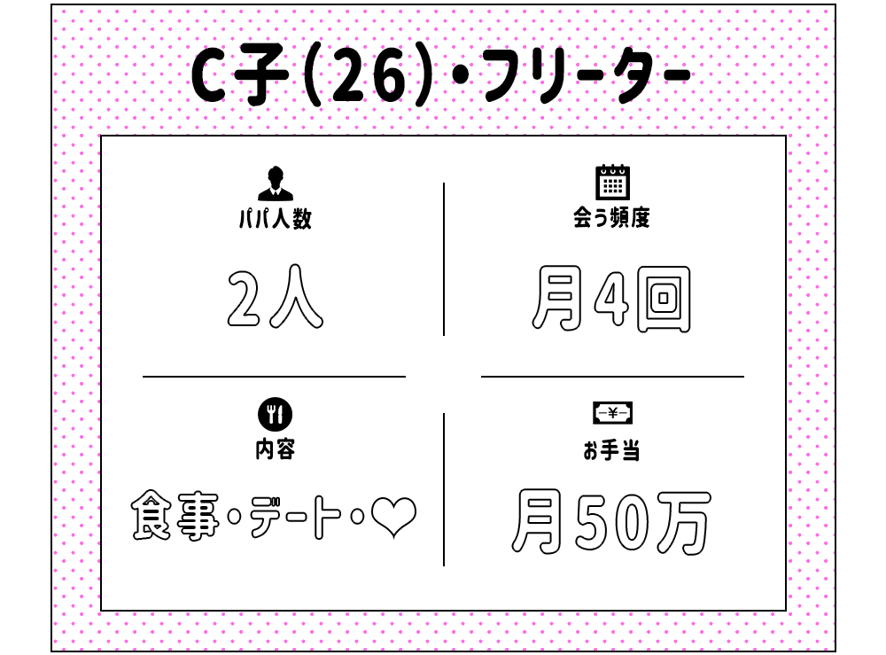 相性が合うパパを見つけるまでは半年~1年程かかりましたが、地道な開拓のおかげで、今では裕福な暮らしが出来て満足しています。